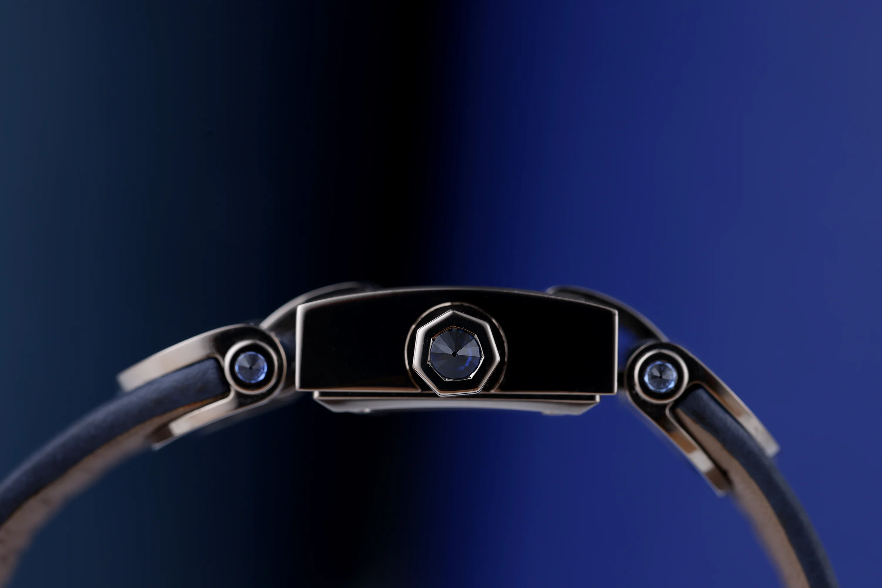 Pre-owned, Unworn DeLaneau ATAME Translucent reference ATAS001.B3 WG TRA02 18k White Gold wristwatch. The Gold dial "Translucent" is Guilloche and Enamelled Email Grand Feu in blue, an 18k White Gold 33mm case set with 108 brilliant-cut diamonds (1.46 cts), 20 baguette-cut bleu sapphires (0.66 ct), the crown and the 4 cabochons are set with blue sapphires (0.47 ct), the double tongue buckle in White Gold is set with 36 brilliant-cut diamonds (0.23 cts). A DeLaneau dark blue suede and leather strap, sapphire crystal glass with anti-reflective coating and automatic movement.
