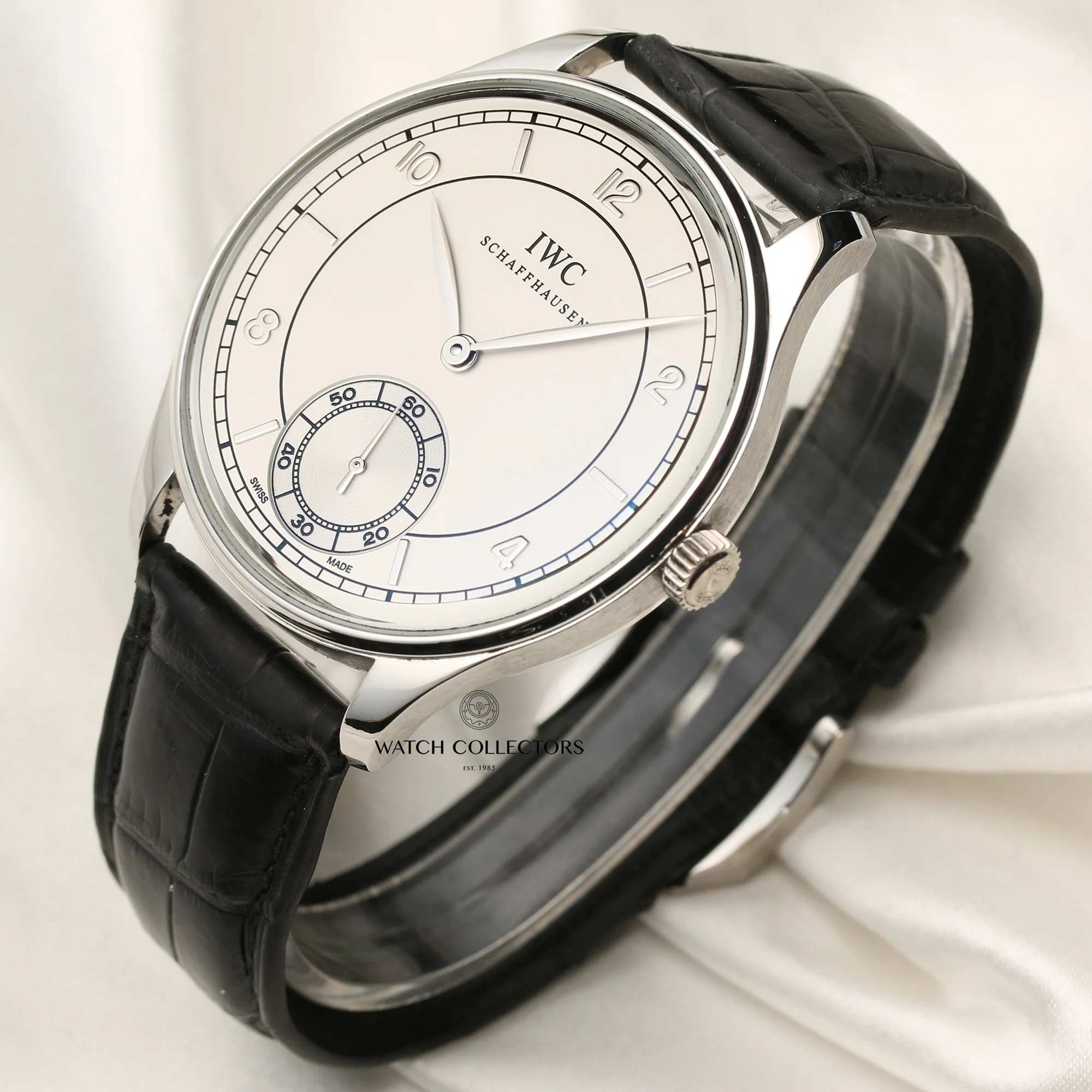 Preowned, excellent condition IWC Portugieser Portuguese reference IW544505 Platinum gents wristwatch. White dial, Arabic numeral and baton hour markers, seconds sub-dial at 6 o'clock, a Platinum 44mm case, bezel, winder, and classic pin buckle, an IWC black leather strap, sapphire crystal glass and a glass skeleton case back showcasing the manual winding movement. Only 500 pieces of this model were made.