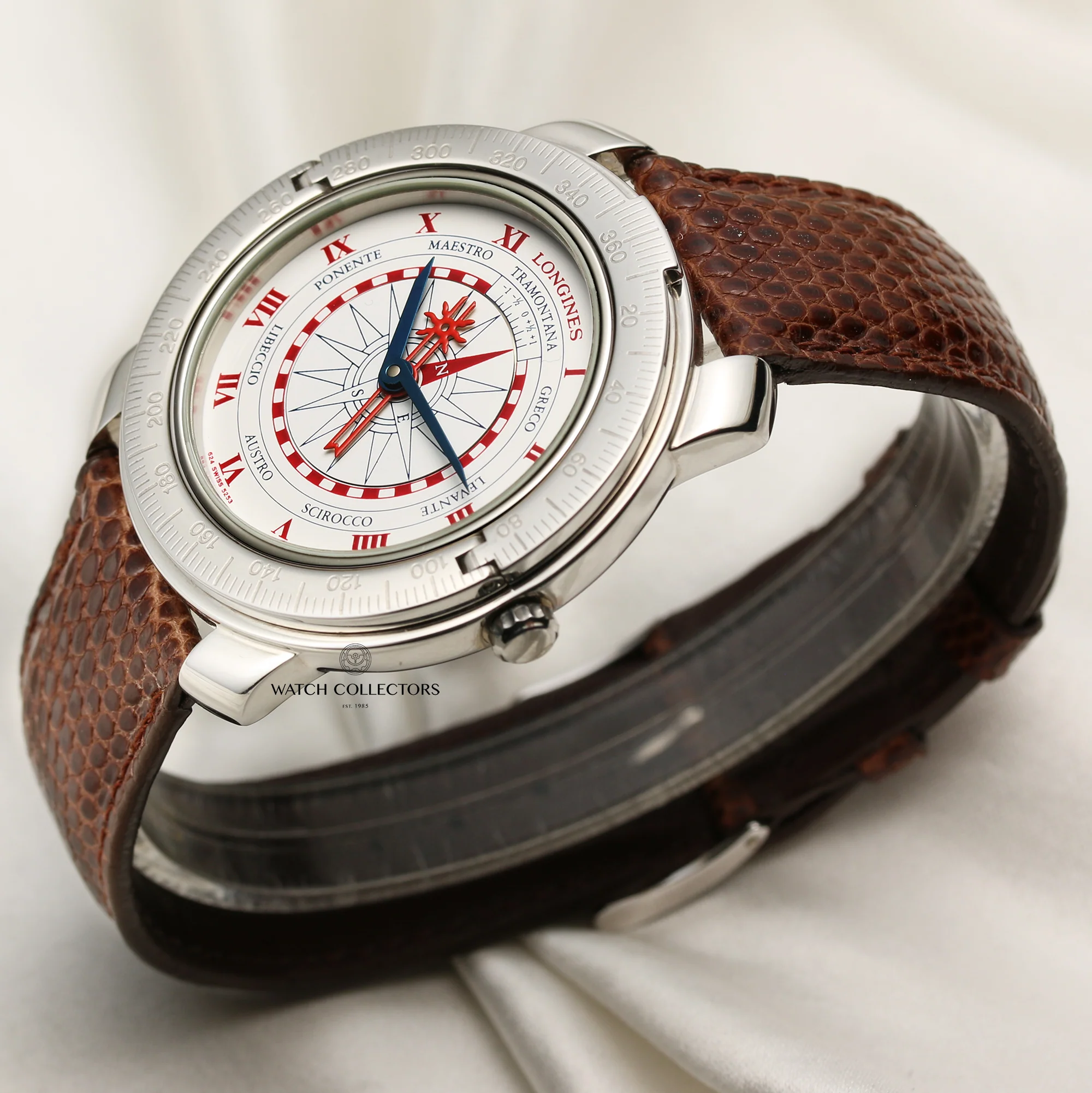 Preowned, excellent condition Longines Christobal C Compass reference 5253 Stainless Steel gents wristwatch. White dial, red Roman numeral hour markers, a Stainless Steel 39mm case, bezel, winder and classic pin buckle, a brown leather strap, sapphire crystal glass and automatic movement.